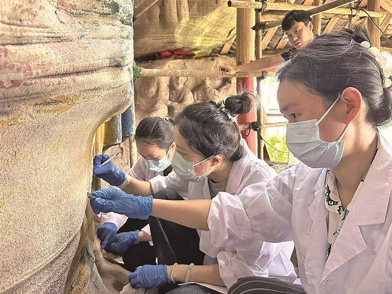 r前不久,四川石窟寺保护研究院、安岳石窟研究院组成专项工作组,在佛湾岩选择3尊造像进行试点修复。工作人员在实地检测的基础上取样进行实验室分析和模拟实验,并根据实验结果制定分级清理方案——对部分妆彩层已经起甲和龟裂严重部位,实施物理剔除;对部分涉及含水泥涂层区域的妆彩层,采用自主研发的脱漆剂清理保护,并辅以热蒸汽予以清理;对石质风化部位的妆彩层,先期予以脱盐、渗透加固后再清理。